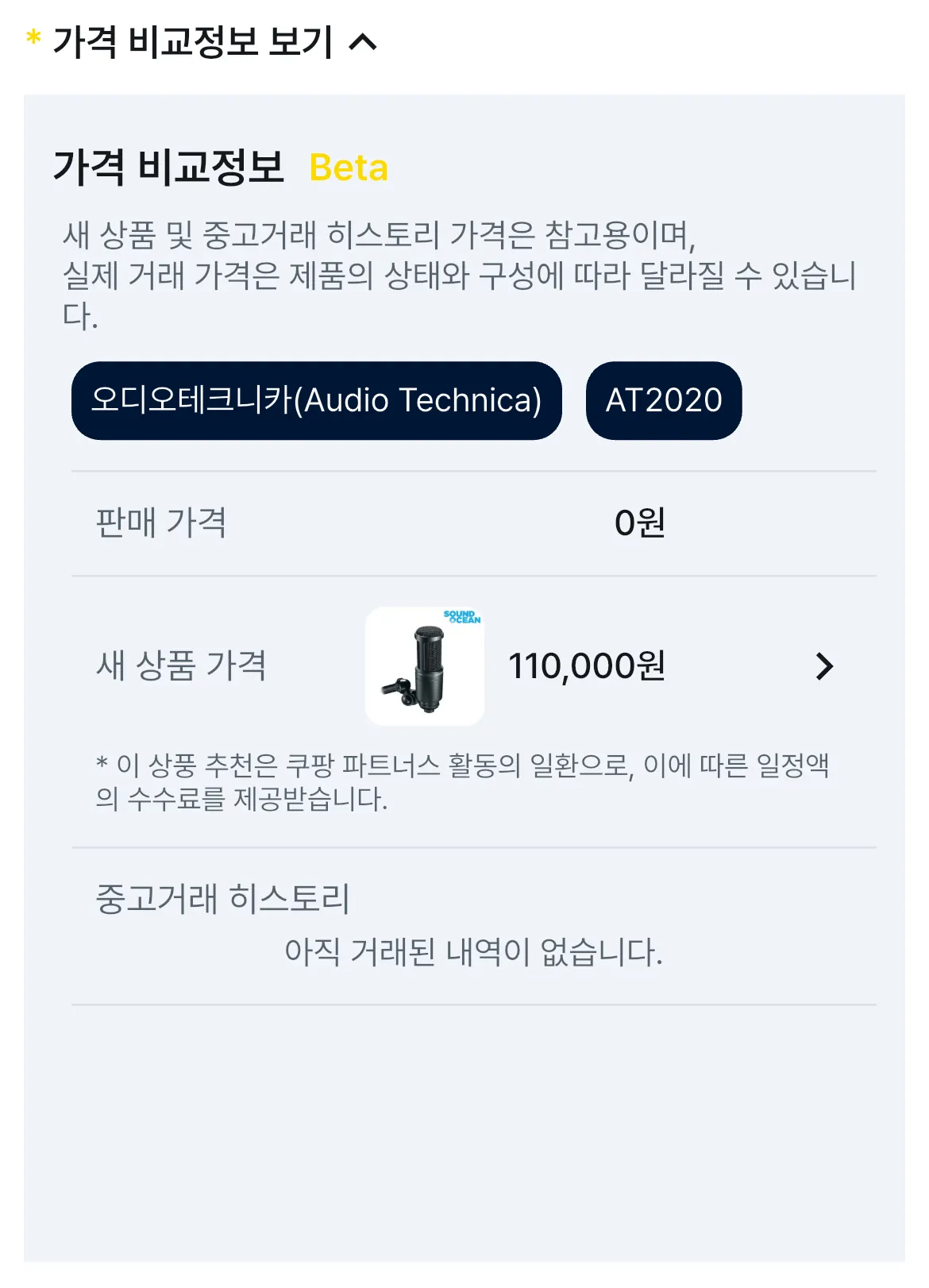 해당 상품의 새 상품 가격과 중고 거래 가격 히스토리가 표시돼요.