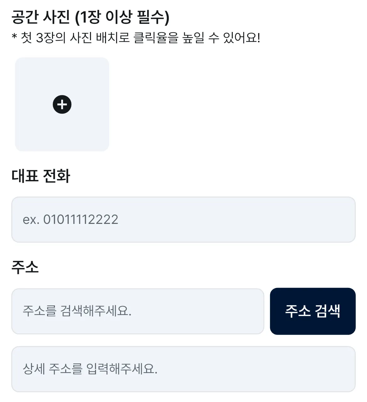 공간의 전체적인 사진과 전화번호, 주소를 입력해주세요.