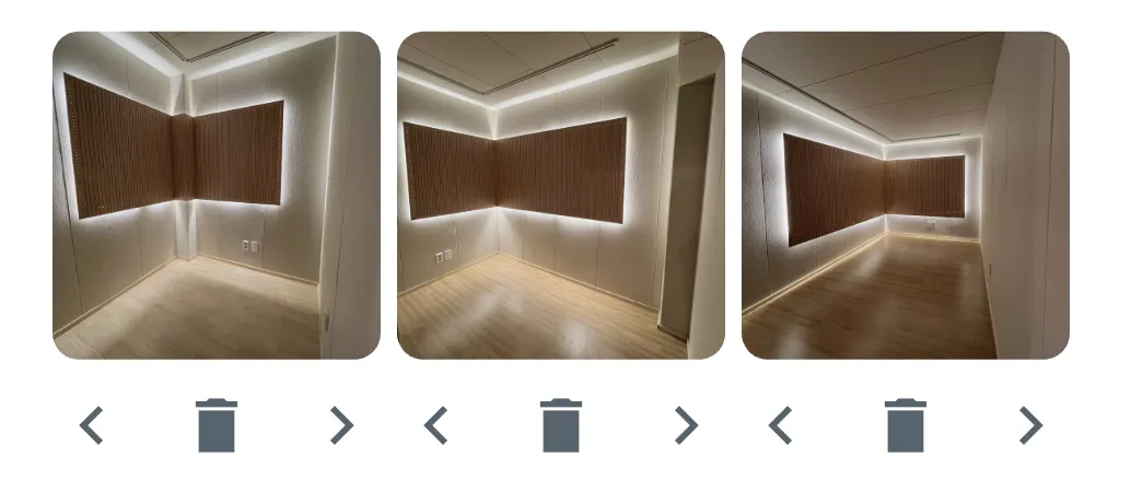 첫 3장이 연습실 리스트에 노출되니 사진 배치를 신경써주세요! < > 화살표를 통해 사진 위치를 움직일 수 있어요.