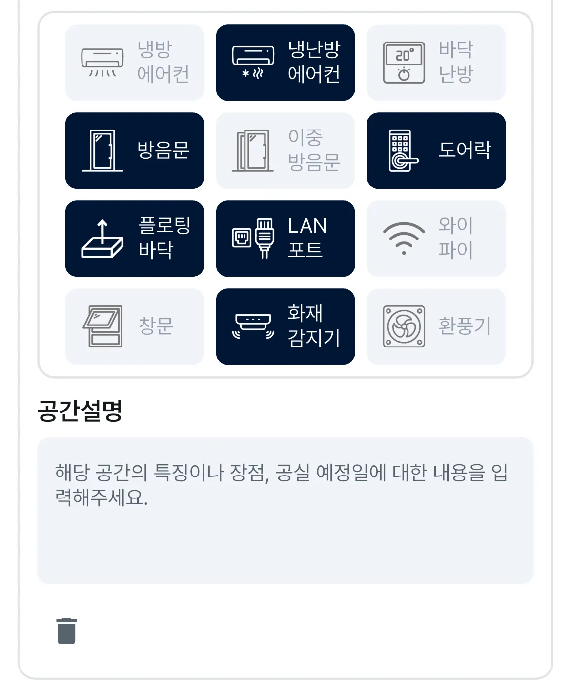 해당 Room에 해당하는 특징을 모두 선택해주시고, 공간설명을 적어주세요.