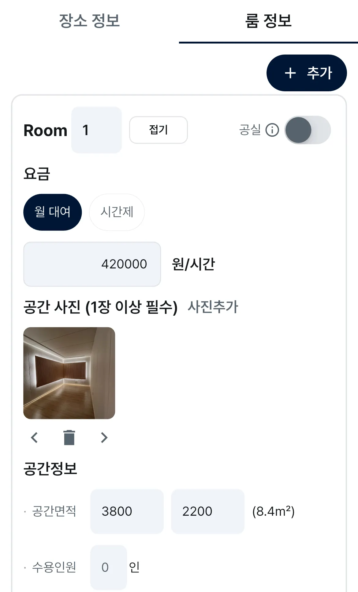 월 대여, 시간제 중 선택 후, 공간 사진과 공간 면적 (가로 x 세로 mm), 수용 인원을 적어주세요.
